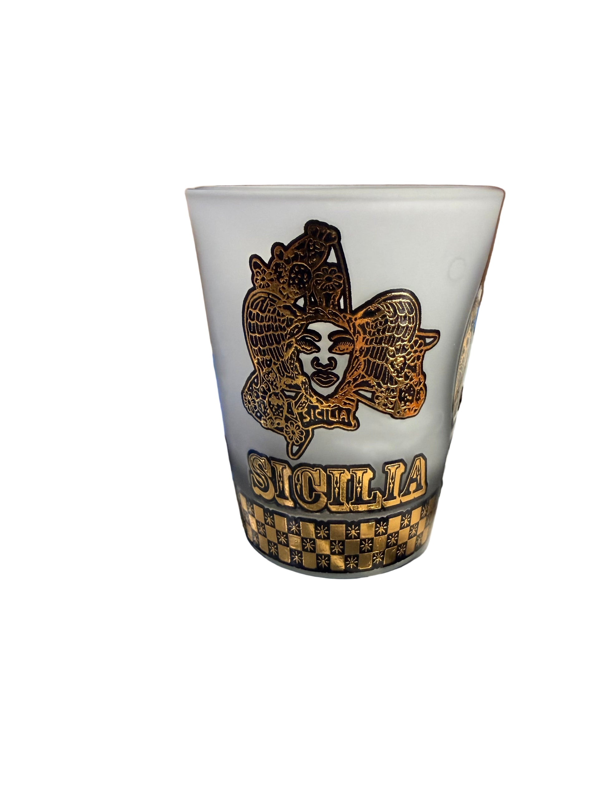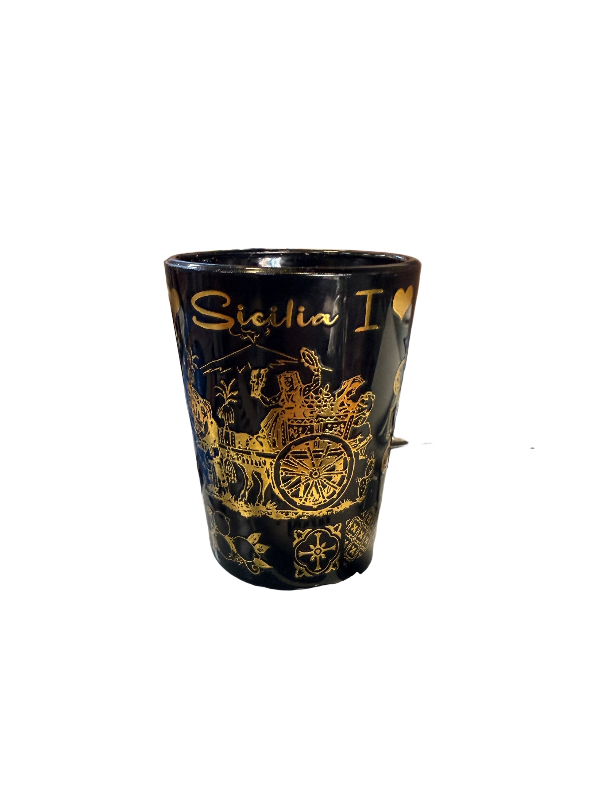 Cada vasito está decorado con motivos inspirados en la cultura siciliana: ánforas coloridas, carro siciliano, flores y detalles barrocos típicos del arte de la isla.