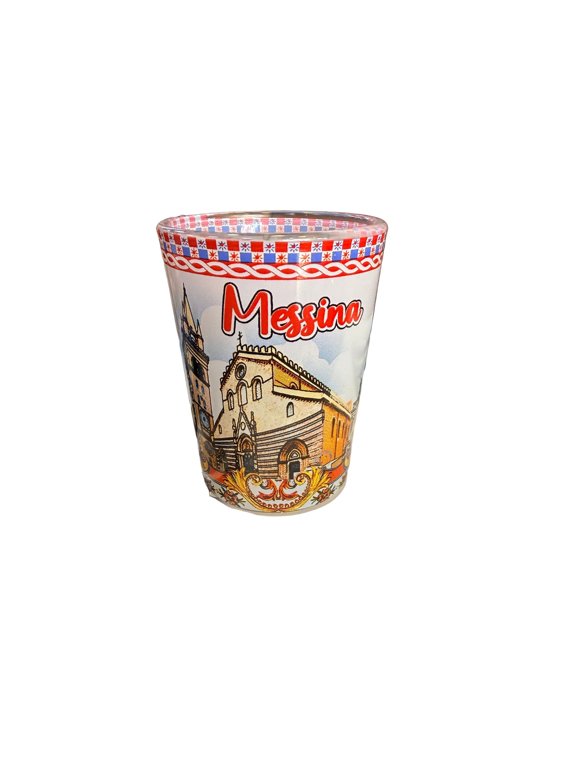 Cada vasito está decorado con motivos inspirados en la cultura siciliana: ánforas coloridas, carro siciliano, flores y detalles barrocos típicos del arte de la isla.
