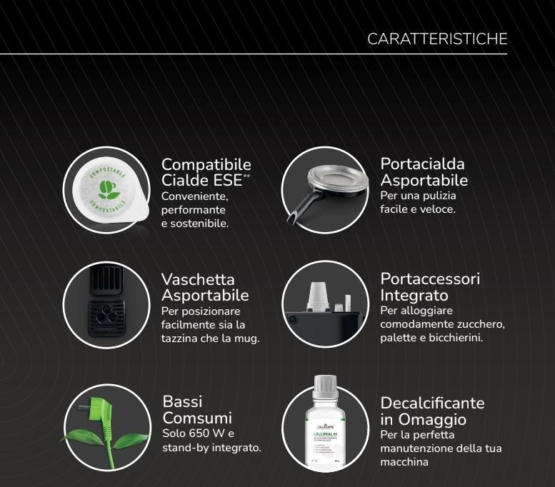 La Kremia es la máquina perfecta para quienes aman un café espresso cremoso, práctico y siempre impecable. Diseñada para usar cápsulas de papel filtro ESE 44 mm, combina un diseño compacto, fiabilidad y funciones inteligentes pensadas para simplificar cada uso.