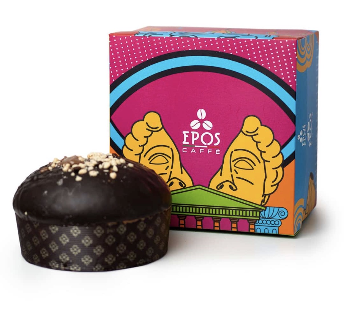 Suave, aromático, sorprendente: el Panettone Artesanal de EPOS Caffè nace de una masa de cacao fermentada lentamente, cubierta con un glaseado de chocolate y realzada con granos de café tostado y crumble de galletas crujientes.